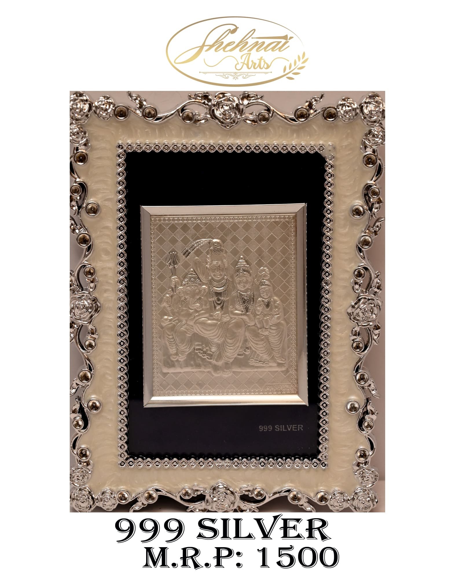 This compact premium frame features Shiv Parivar in a classic darbar arrangement. Lord Shiva sits centrally with Maa Parvati, flanked by Shri Ganesh and Kartikeya, conveying completeness, protection and grace. Finely chased textures on the 999 silver plaque bring out jewels, drapery and divine expressions against a diamond-check backdrop.